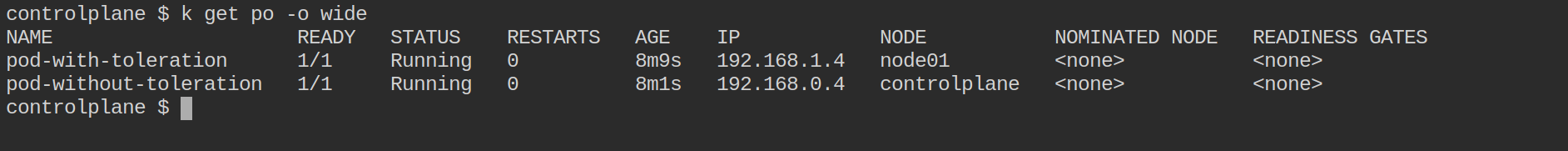 Du wirst sehen, dass der pod-with-toleration Pod auf node01 geplant wurde, da er die Taint auf node01 tolerieren konnte. Der pod-no-toleration Pod hingegen wurde auf dem controlplane-Node geplant, da dort keine Taint vorhanden war.