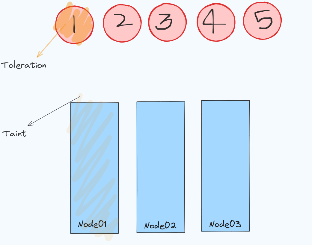 In dem obigen Bild siehst du drei Nodes – Node01, Node02 und Node03 – zusammen mit 5 Pods. Auf Node01 wurde ein Taint angewendet, während Pod1 der einzige Pod ist, der diesen Taint tolerieren kann. Das bedeutet, dass Pod1 auf Node01 geplant werden kann, während die restlichen Pods niemals auf Node01 geplant werden können, weil sie den Taint nicht tolerieren, den Node01 hat. Wichtig ist, dass Taints und Tolerations keine Garantie dafür geben, dass Pod1 ausschließlich auf Node01 geplant wird. Es ist möglich, dass Pod1 auch auf einem anderen Node geplant wird – während die anderen Pods auf jedem Node außer Node01 geplant werden können.