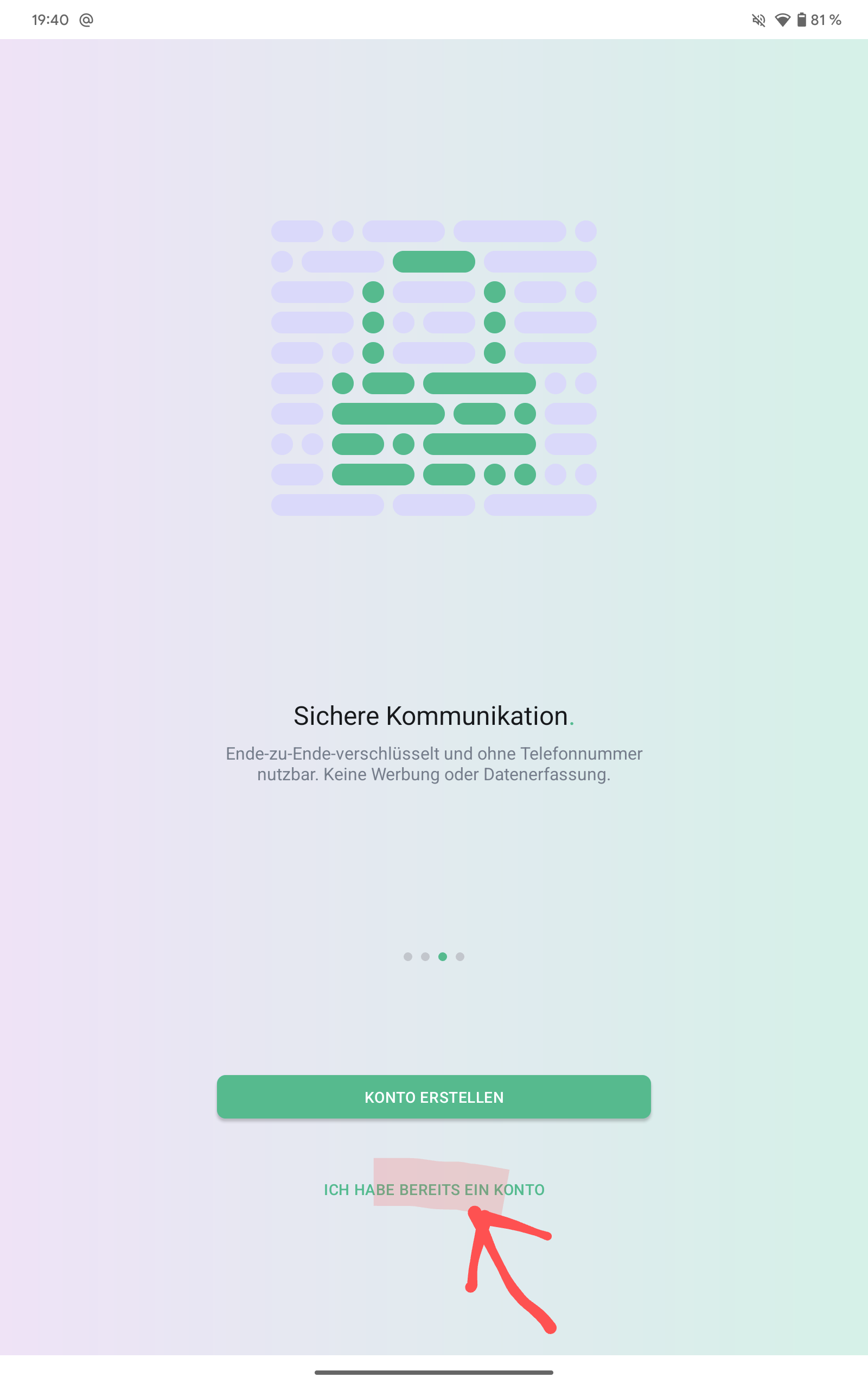 Ansicht direkt nach dem Start der App. Hier muss ausgewählt werden das Ihr bereits einen Account habt.