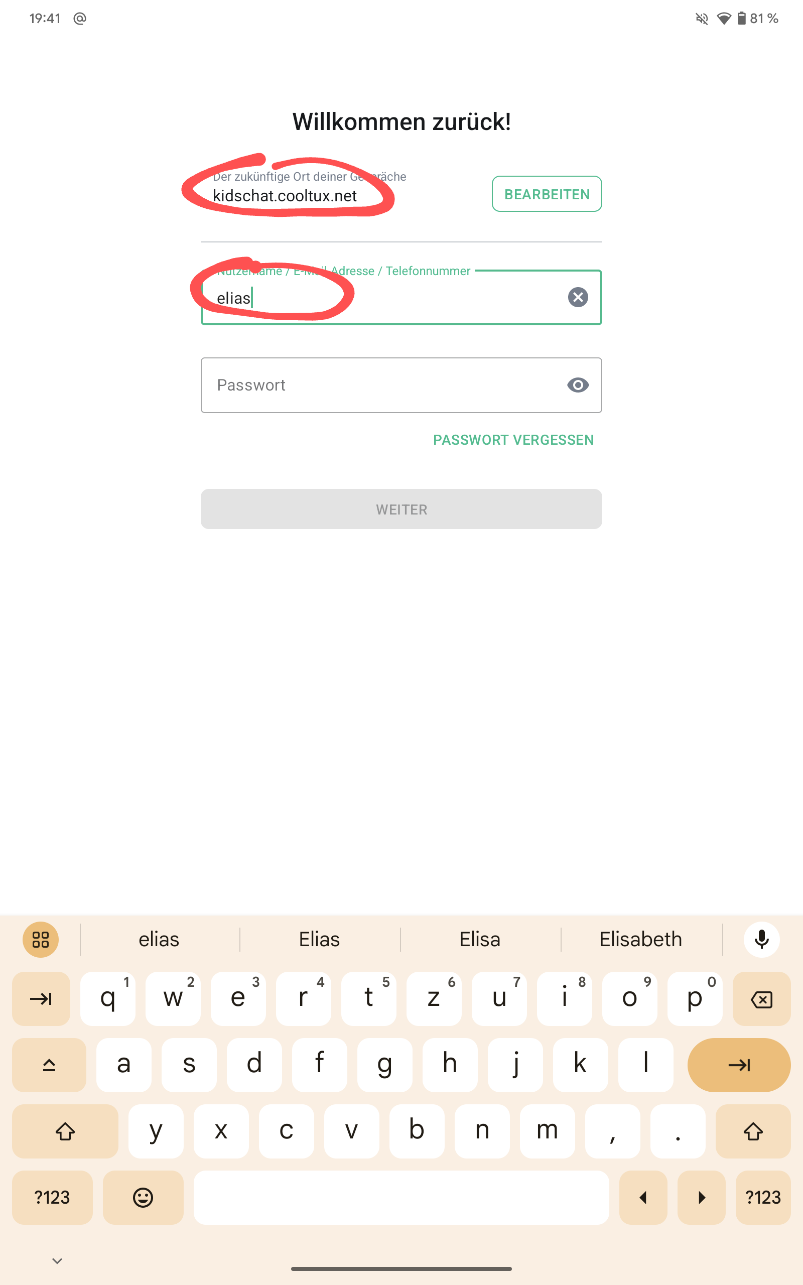 Wenn Ihr die Server Adresse geändert habt könnt Ihr Euch am Kidschat Server anmelden. Dazu die entsprechenden Felder mit den Daten welche Ihr von mir bekommt ausfüllen. Also „Nutzername“ und darunter „Passwort“