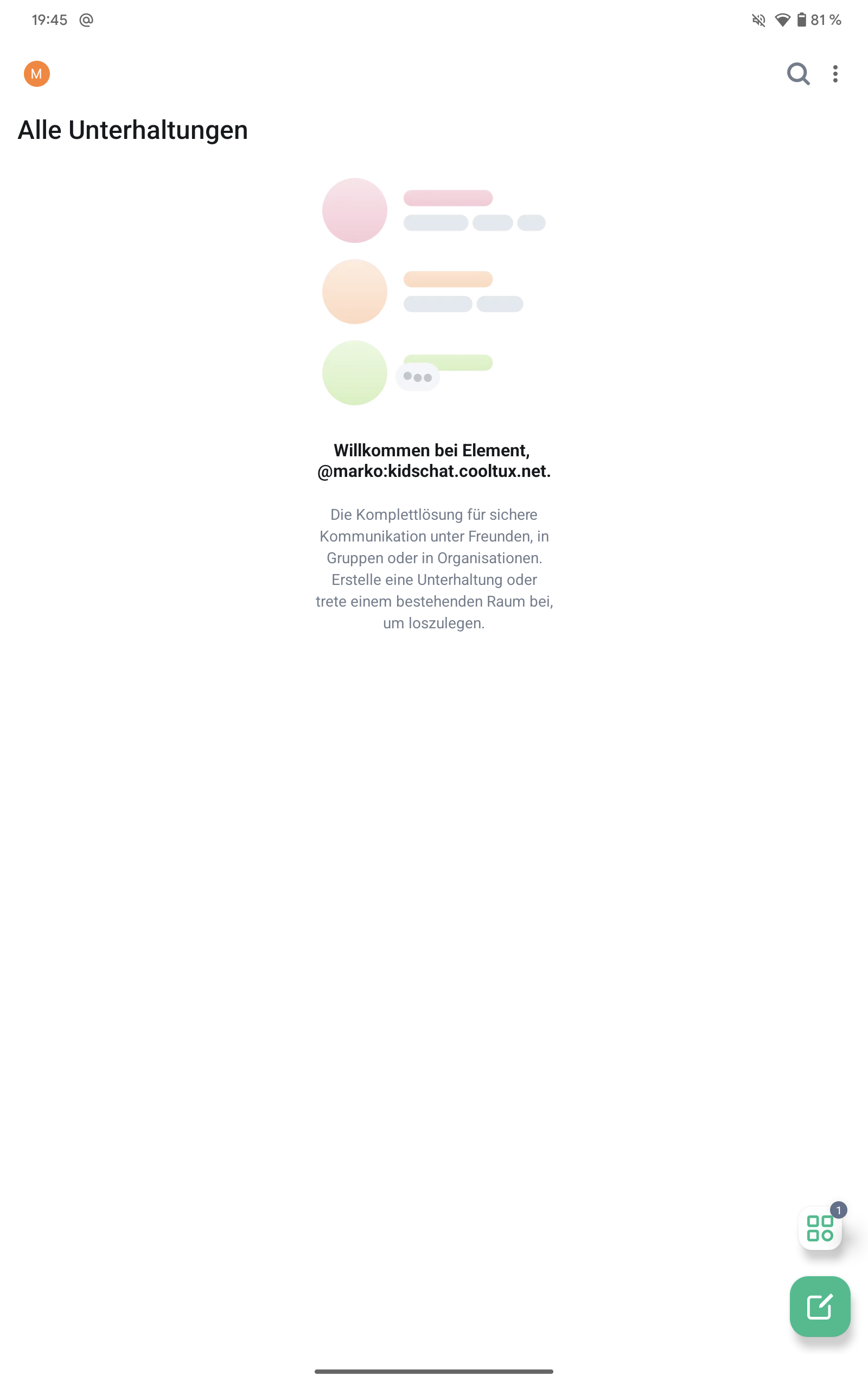 Ich habe mir erlaubt für unsere Kinder einen eigenen Chat Server basierend auf dem Matrixprotokoll auf zu bauen. Hier können die Kids abgeschottet von jeglichen äußerlichen Kontakt Möglichkeiten in Ruhe sich Direktnachrichten schicken oder Unterhaltungen in Räumen abhalten. Auch Videocalls sind möglich.